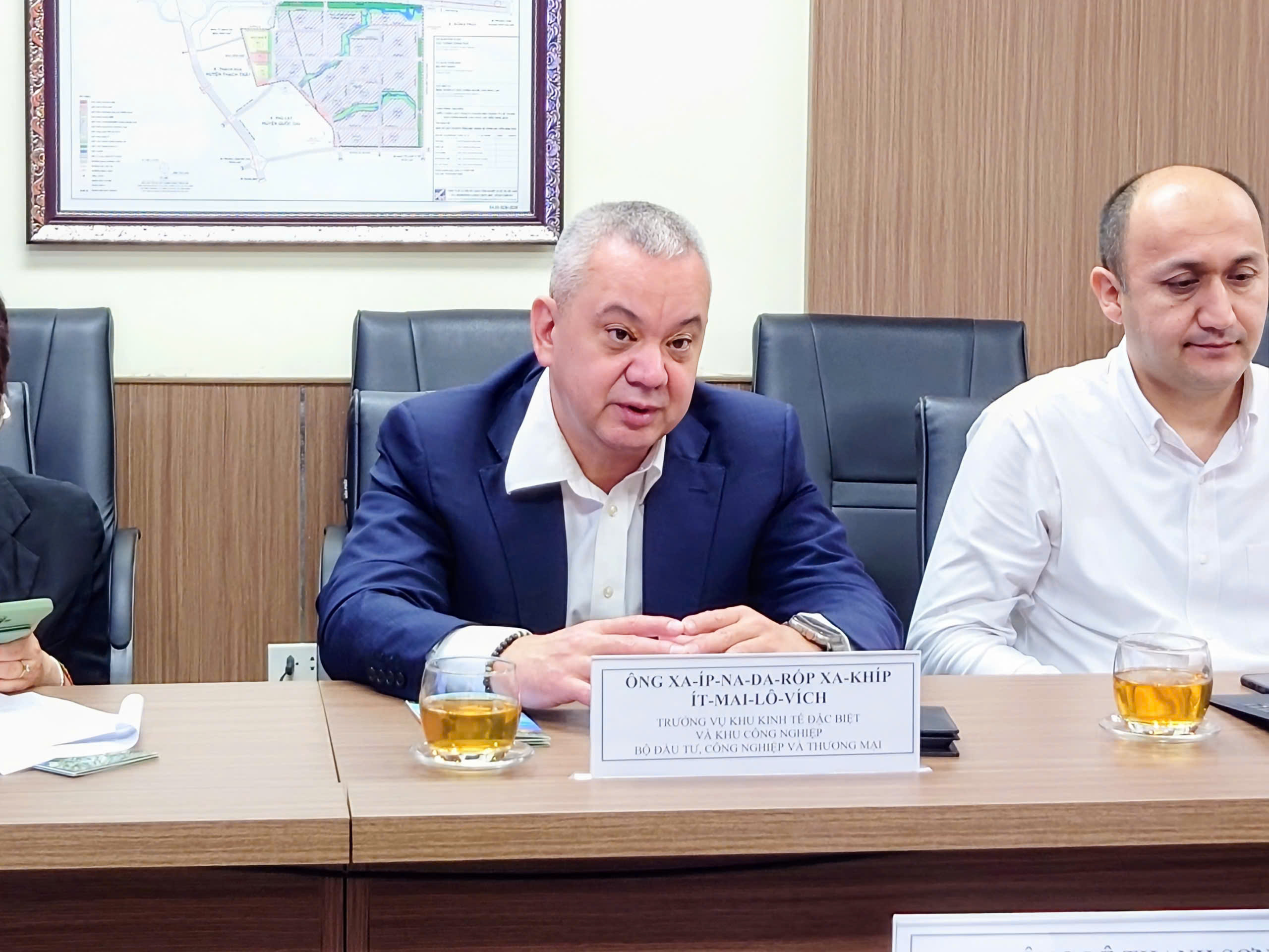 Ông Saifnazarov Saxib Ismailovich, Trưởng Vụ Khu Kinh tế đặc biệt và Khu Công nghiệp thuộc Bộ Đầu tư, Công nghiệp và Thương mại Uzbekistan trao đổi tại buổi làm việc